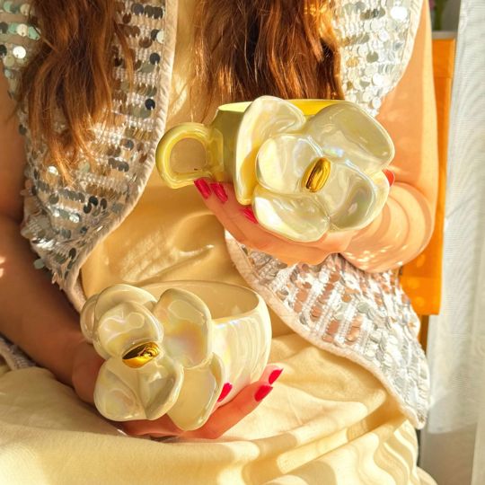🌸✨ Blossom Cup & Saucer – Handcrafted Iridescent Ceramic Tea Set with 3D Floral Design & Golden Bloom Accent ☕🌼💛